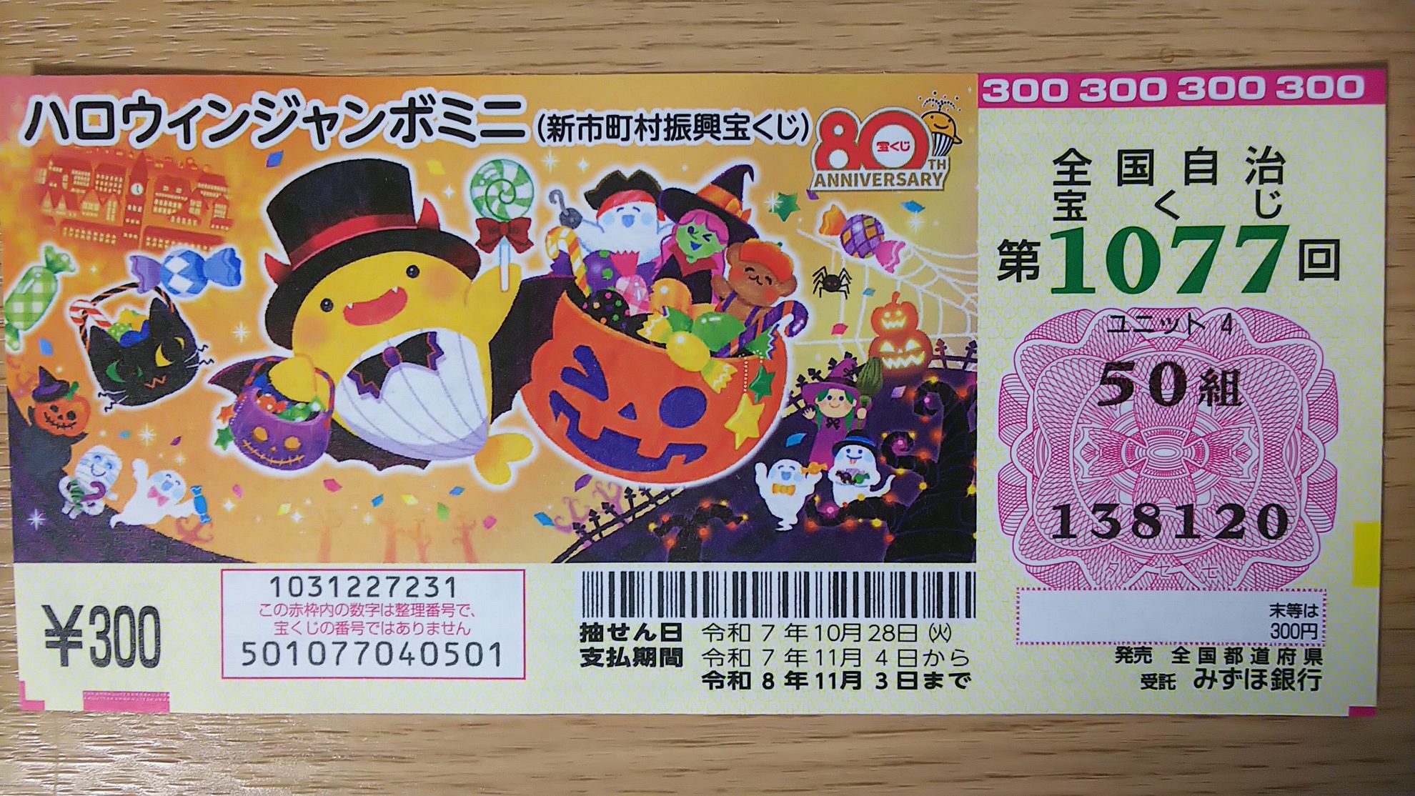 ハロウィンジャンボは1口300円なので、30枚購入で9000円となり1万円以内です。