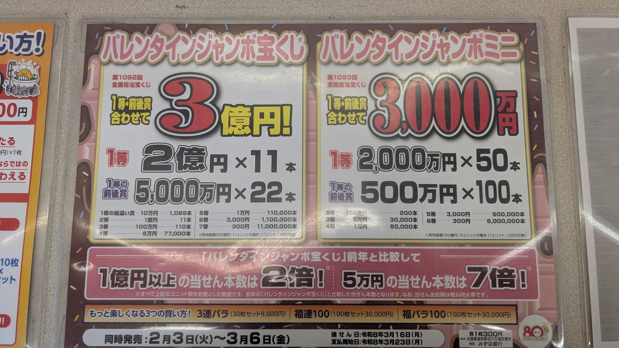 2026年のバレンタインジャンボ宝くじの1等賞金額や本数、前後賞はいくらなのか!?