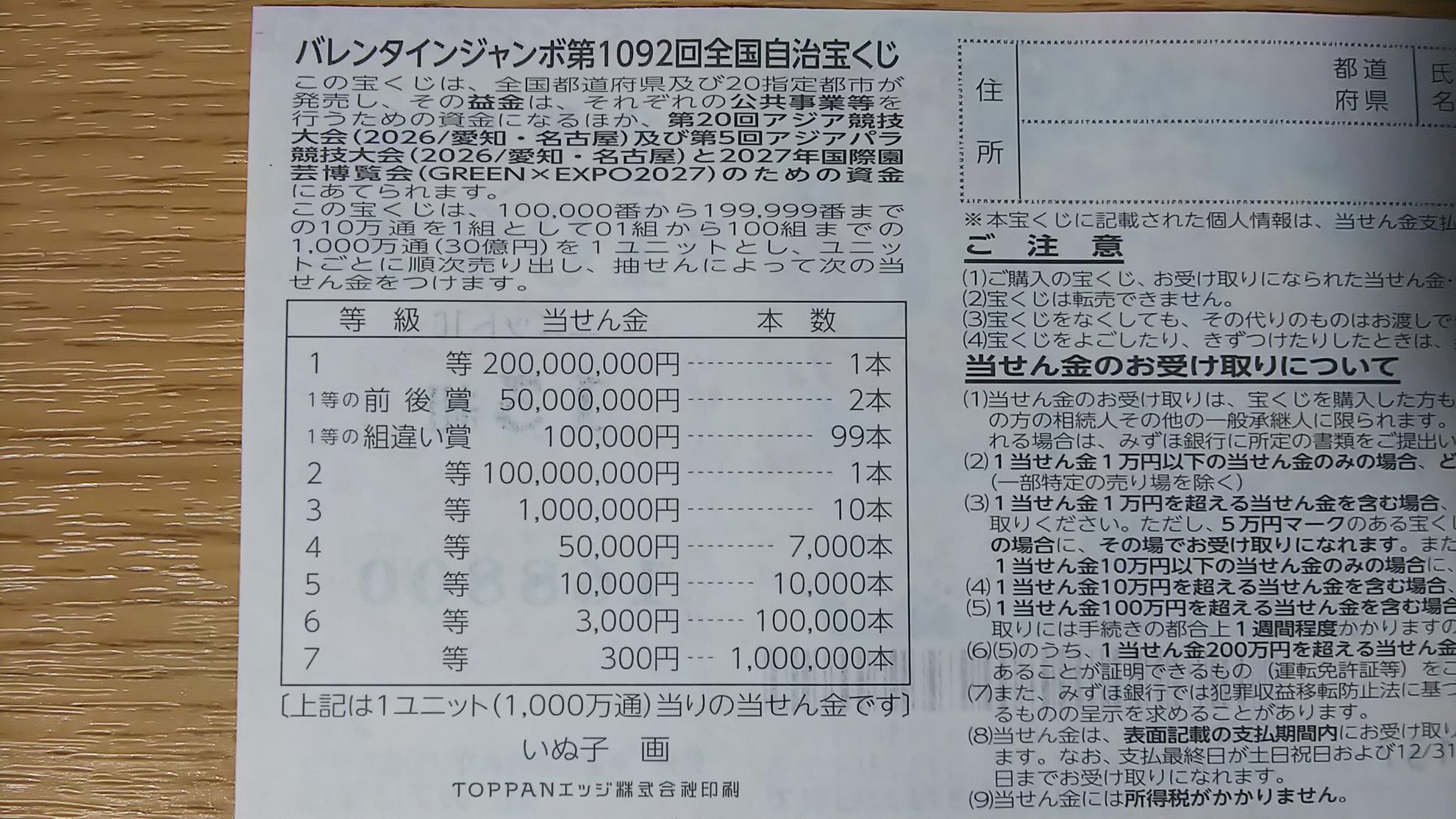 2026年のバレンタインジャンボ宝くじの当選確率はどうなのか。