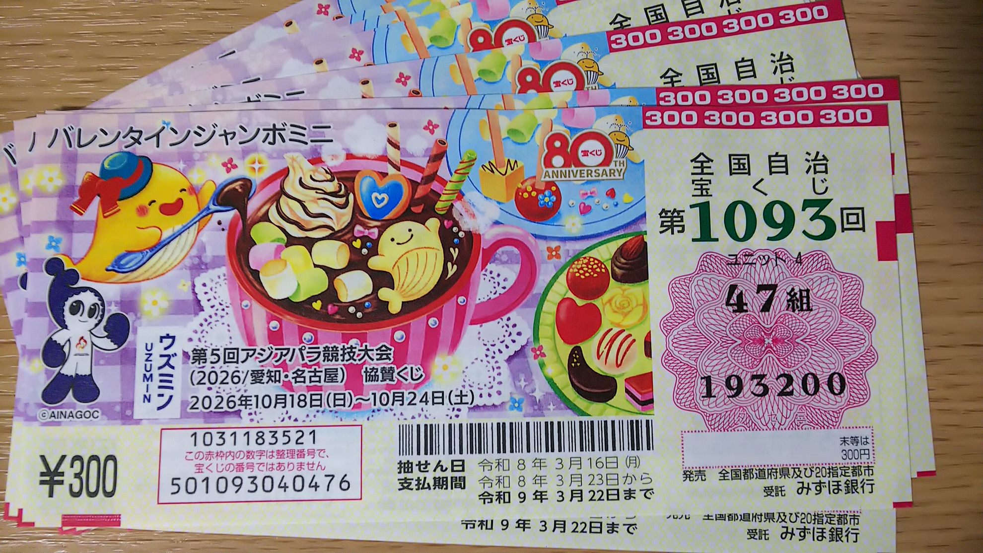 2025年のバレンタインジャンボミニ(第1042回)の抽選日は3月18日(火)になります。